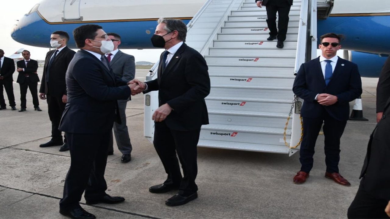 ووجد السيد بلينكن في استقباله بمطار الرباط سلا وزير الشؤون الخارجية والتعاون الإفريقي والمغاربة المقيمين بالخارج، السيد ناصر بوريطة.